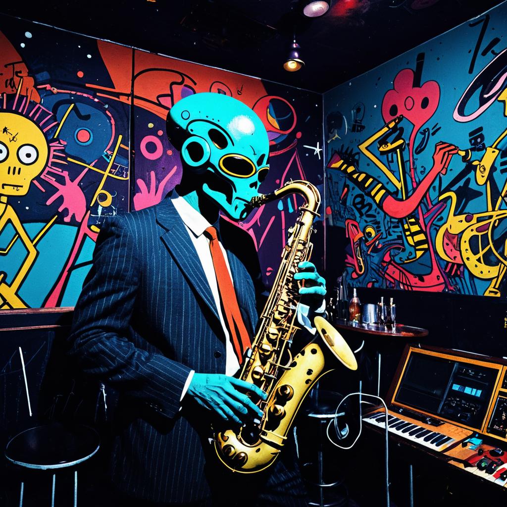 Lowbrow art of an alien saxophonist in a futuristic jazz club, influenced by Jean-Michel Basquiat and Yoshitomo Nara, with bold graffiti lines with muted electric colors, funky and vibrant, set in a cosmic nightclub