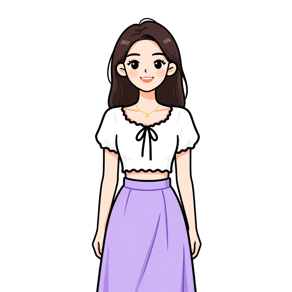 This is a digital illustration of a young woman standing against a plain white background. She has fair skin, large blue eyes, and shoulder-length dark brown hair. She wears a purple, semi-transparent, puffed-sleeve crop top tied in the front, paired with high-waisted pink capri pants. Her black ankle boots have a chunky sole. The illustration has a cartoonish style with bold outlines and vibrant colors. The woman's expression is neutral, and she stands with her arms relaxed by her sides. The overall aesthetic is modern and fashionable.