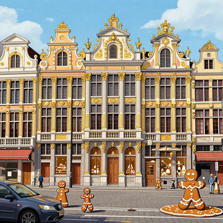 "Gingerbread A street scene in Brussels in the style of the comic book artist François Schuiten, Brussels architecture, neoclassical architecture, surrealism,"
