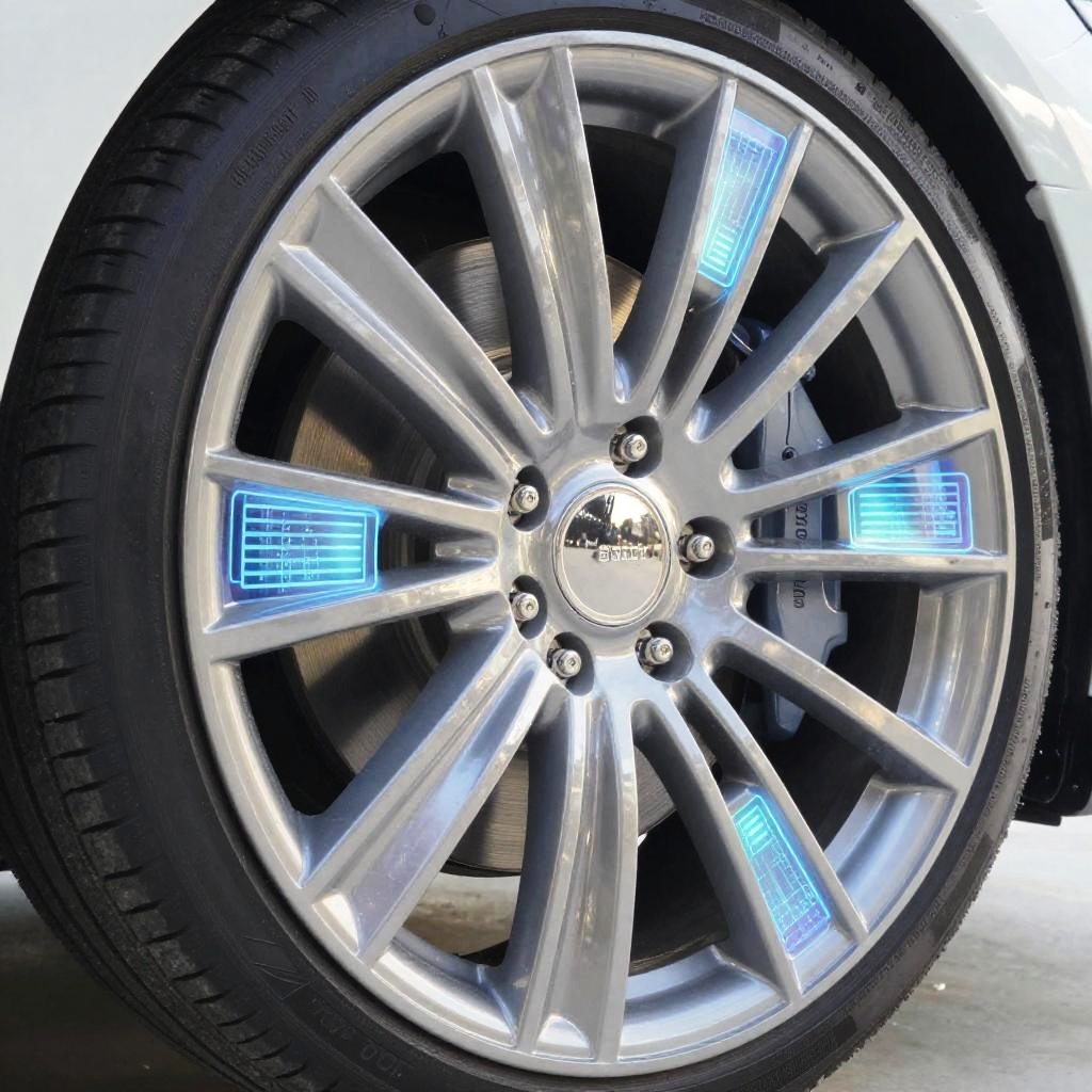 Close-up of a futuristic wheel with transparent materials and embedded holographic displays, reflecting a bright futuristic environment, ultra-realistic