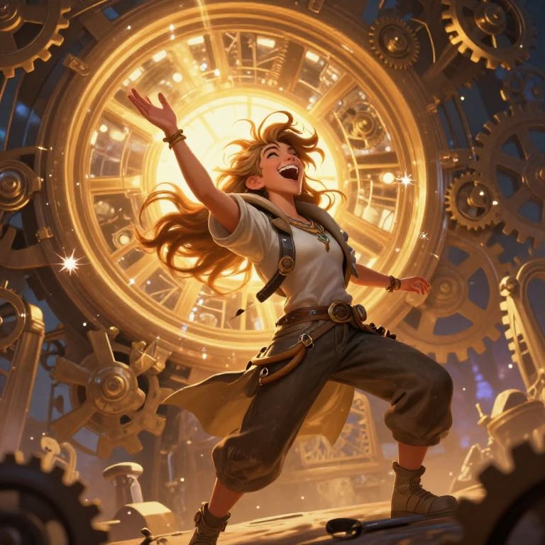 Gear 5 laughing, fantasy epic scene, giant clockwork gears turning overhead, radiant laughter with sparks of magic, detailed character design with flowing hair and animated pose