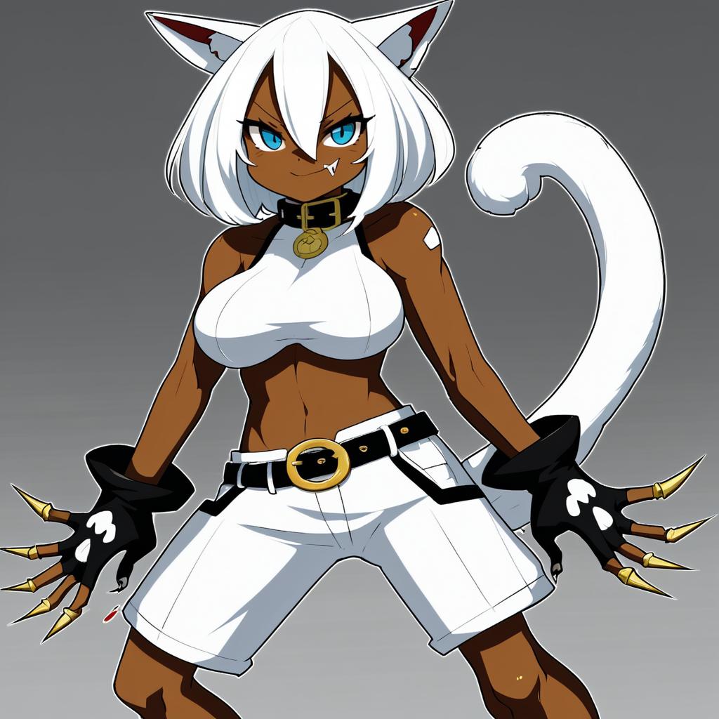 Ms. fortune (skullgirls), skullgirls, 1girl, dark-skinned female, cat ears, cat tail, fang, blue eyes, short hair, white hair, bob cut, medium breasts, large breasts, underboob, navel, barefoot, scar, fingerless gloves, bare shoulders, belt, collar, sharp fingernails, crop top, midriff, by artist purin jiisan, anime