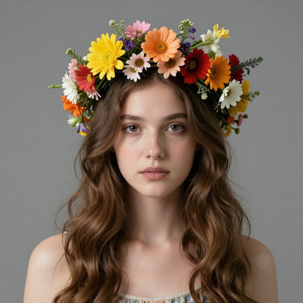 Photograph of a young woman with fair skin and wavy, brown hair. She wears a colorful floral crown featuring yellow, orange, red, and white daisies, along with small purple and green leaves. She has a neutral expression, looking directly at the camera. Her shoulders are bare, and she wears a simple, white strapless top. The background is a solid, light gray color, making her and the floral crown the focal points. The image has a soft, natural light, emphasizing her delicate features and the vibrant colors of the flowers.