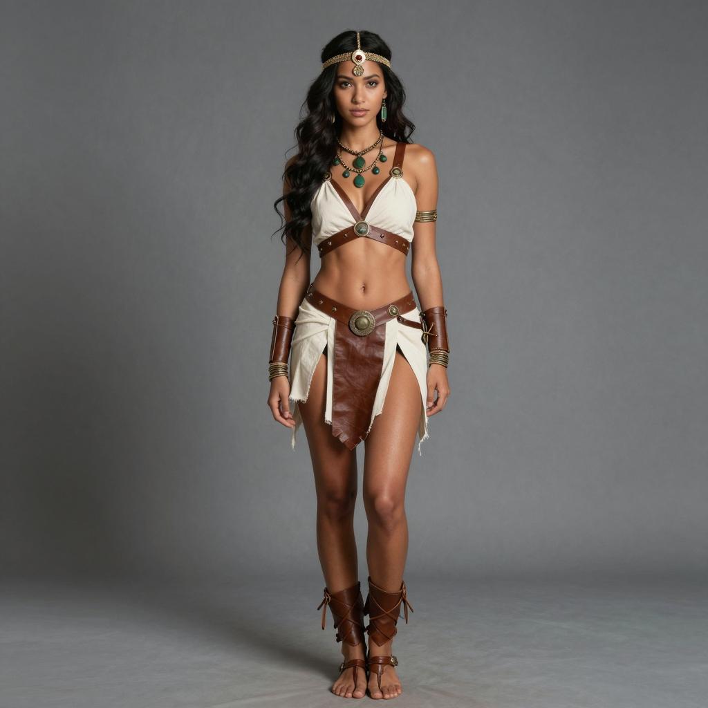 Slutty katara costume, photorealistic, full body shot, young woman, dark long wavy hair, tribal warrior outfit, white draped skirt with brown leather straps, brown leather sandals, white cropped top with brown straps, gold headpiece with jewels, gray fabric background, standing, front view, neutral expression, ethnic jewelry, high contrast lighting, fantasy cosplay, earthy tones, ancient civilization aesthetic, slim and toned physique, detailed ures