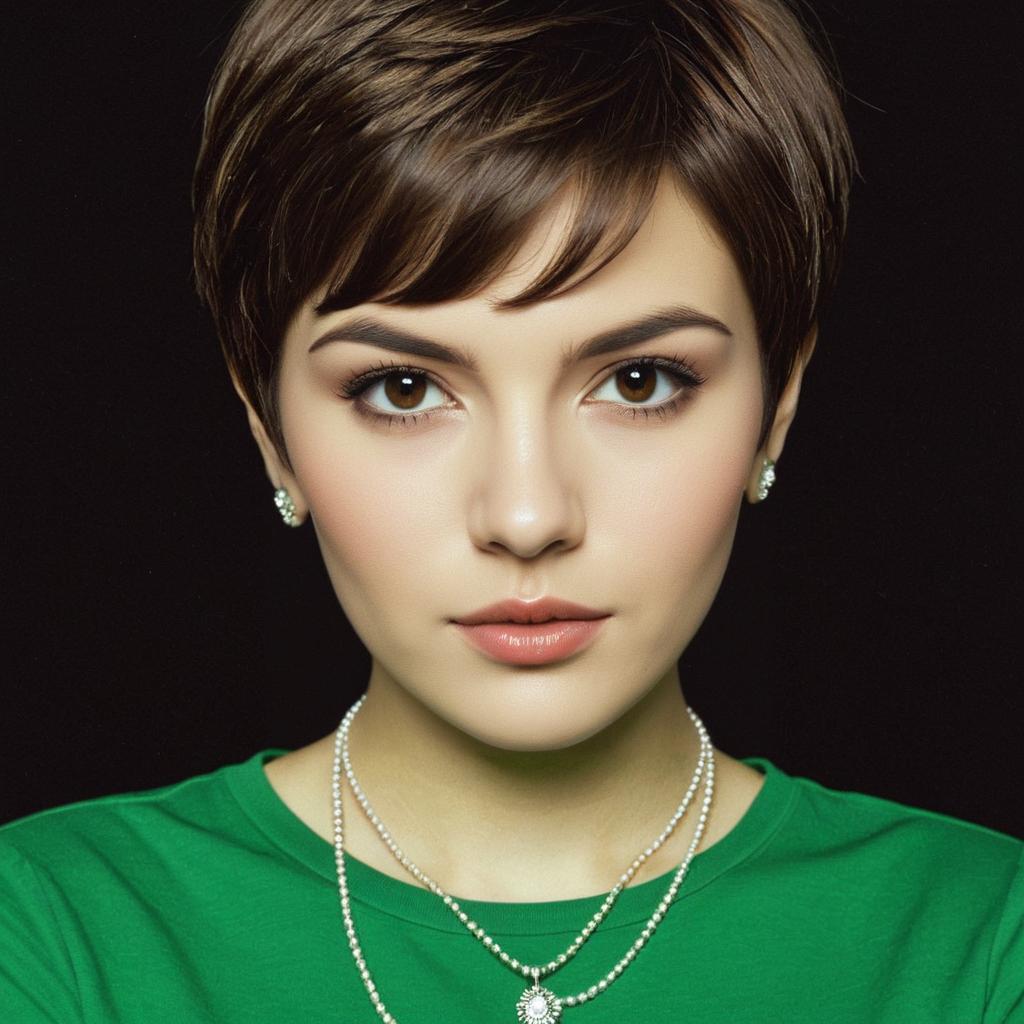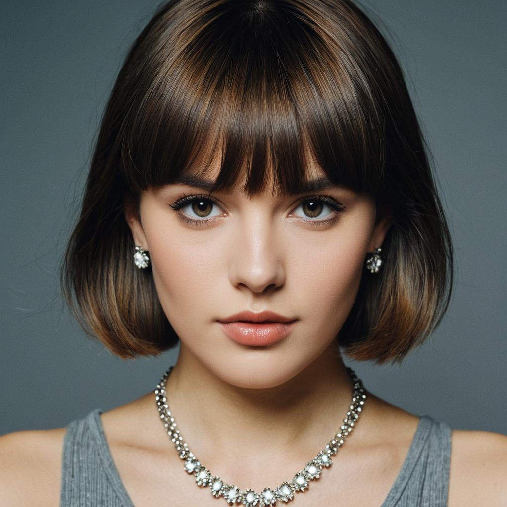 Layered bob haircut curly,1girl, solo, jewelry, necklace, looking at viewer, brown hair, curly hair, realistic, upper body, lips, freckles, closed mouth