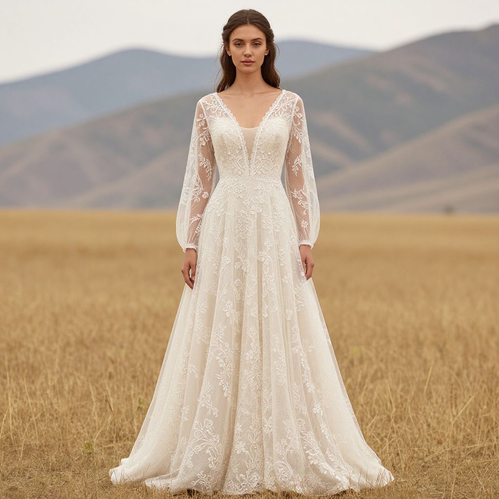 Elegant young woman wearing a delicate lace country wedding dress with sheer long sleeves and floral embroidery, standing gracefully in a golden field with mountains in the background.