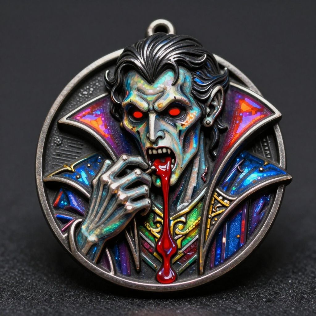 Metal trinket depicting a Vampire - Undead creature that feeds on the blood of the living. Lawrence Weiner, natural, shimmering, vibrant, gothic, rpg, 1400ad, ultra detailed, detailed, immersive, reminiscent of high fantasy RPG games, HD, masterpiece, best quality, hyper detailed, super realistic, perfect face, perfect hands, award-winning, professional, breathtaking, linquiveraairy Mesaheated weatherretro game art . 16-bit, vibrant colors, pixelated, nostalgic, charming