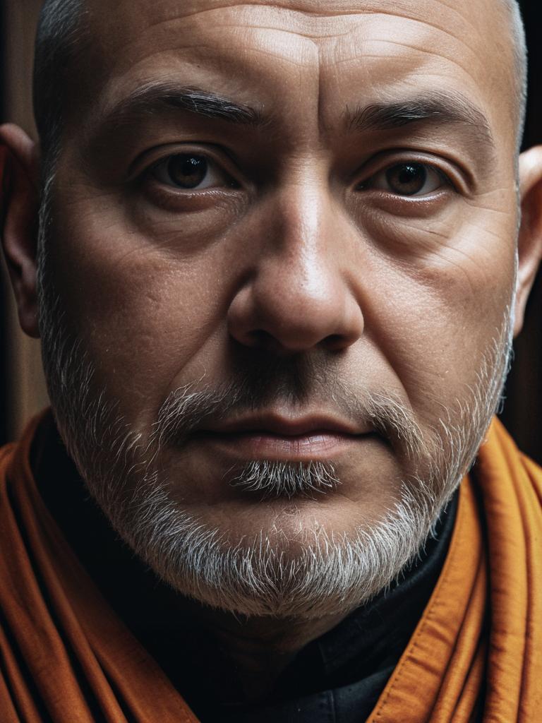 Photorealistic close-up headshot of a middle-aged man with a shaved head and trimmed beard, wearing a traditional brown and orange monk robe. The image highlights detailed facial features and intense eyes, evoking a calm and contemplative mood.