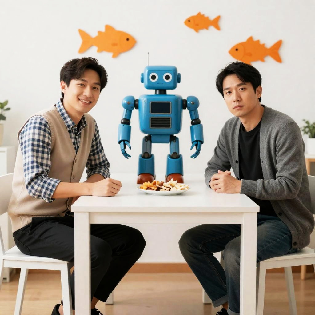 Two men sitting at a table in a brightly lit room. Left man with plaid shirt, beige vest, black pants, smiling. Right man with gray cardigan, black shirt, serious expression. Blue robot, orange fish wall decorations, snacks on table.