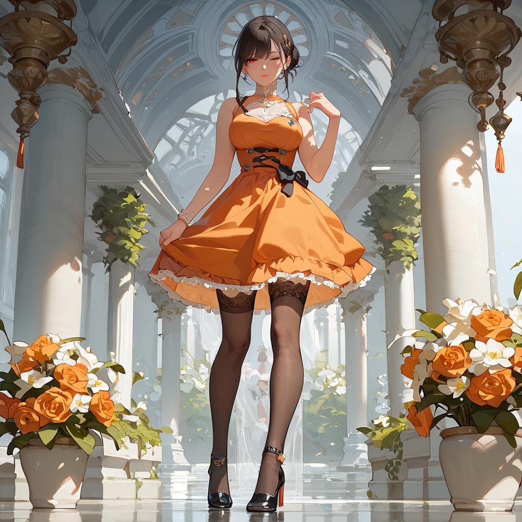 Anime-style digital illustration of a black-haired woman in an orange dress, black stockings, and heels, standing in a sunlit, arched, floral