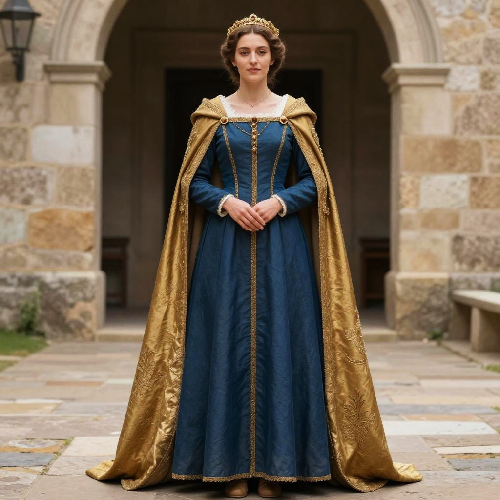 Medieval cloak dress, a woman in a blue dress and a gold cape