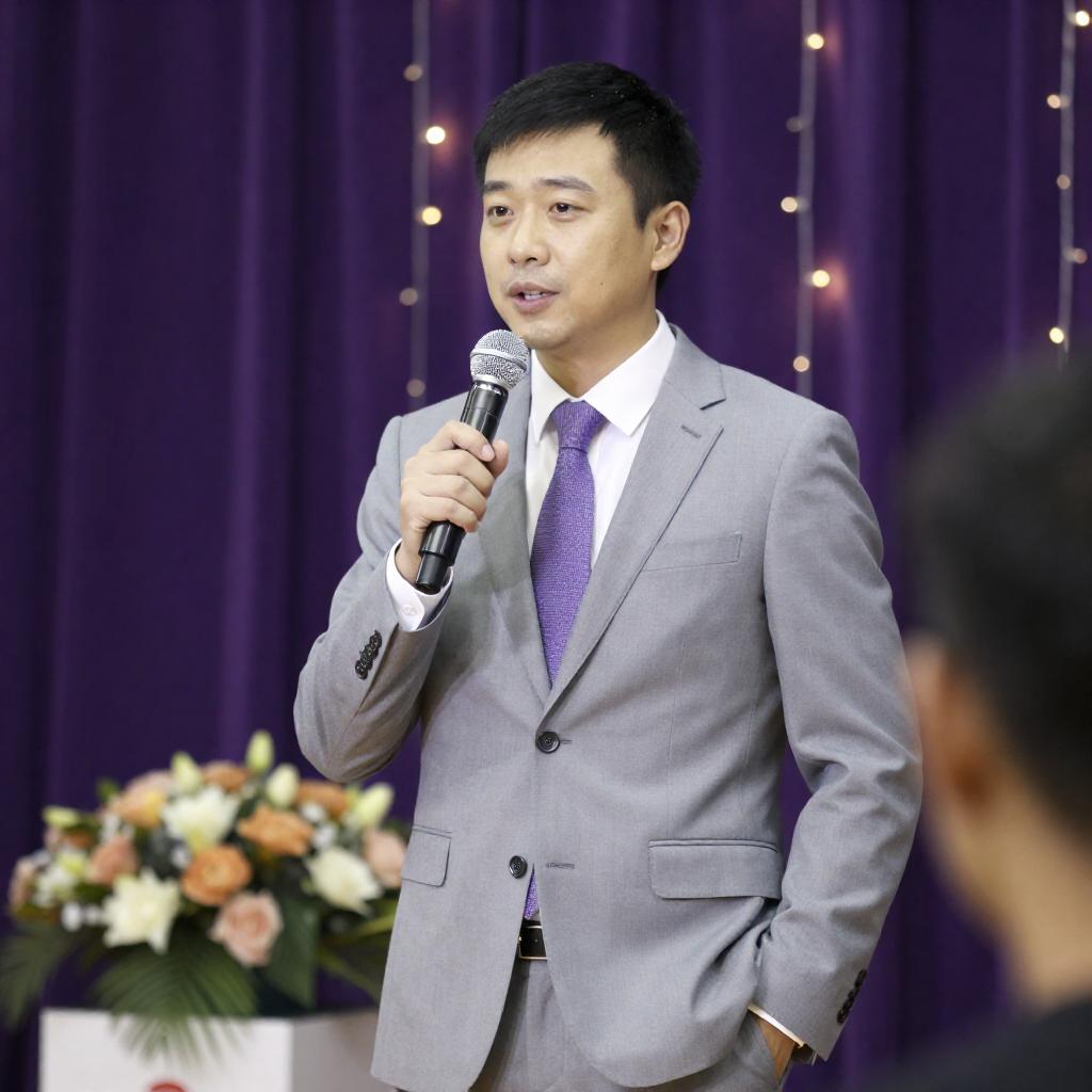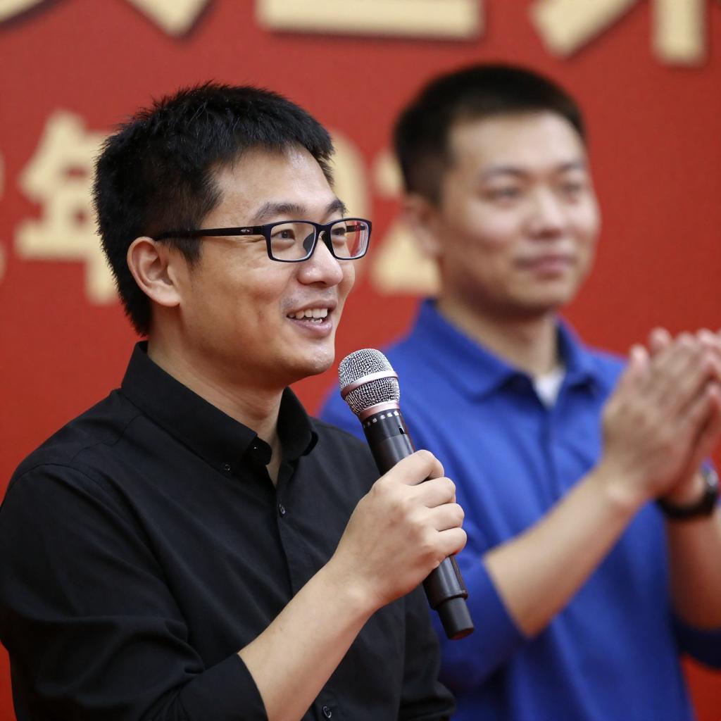 Portrait of an Asian man with short black hair and glasses, wearing a black shirt, smiling and speaking into a microphone. Another Asian man in a blue shirt is blurred in the background clapping. The setting has a red backdrop with indistinct text.