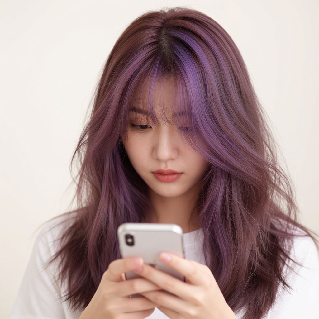 Photograph of an Asian woman with long, wavy, purple-tinted black hair and bangs, focusing intently on her smartphone. She has fair skin, light pink lips, and is wearing a plain white top. Her hands, with neatly trimmed nails, are holding the phone at chest level. The background is a pure white, making her the central focus. The lighting is soft, highlighting the texture of her hair and the smoothness of her skin. Her expression is neutral, and she appears to be engrossed in whatever is on her phone screen.
