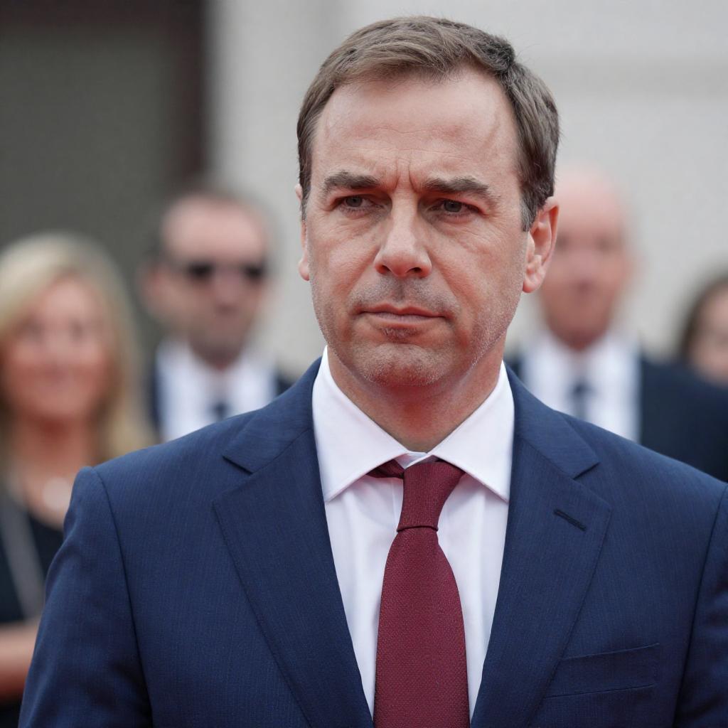 Photograph of a middle-aged man with short brown hair, wearing a gray suit, white shirt, and black tie. He has a focused, slightly intense expression, looking to the side. Blue, ured background with a blurred, indistinct figure.
