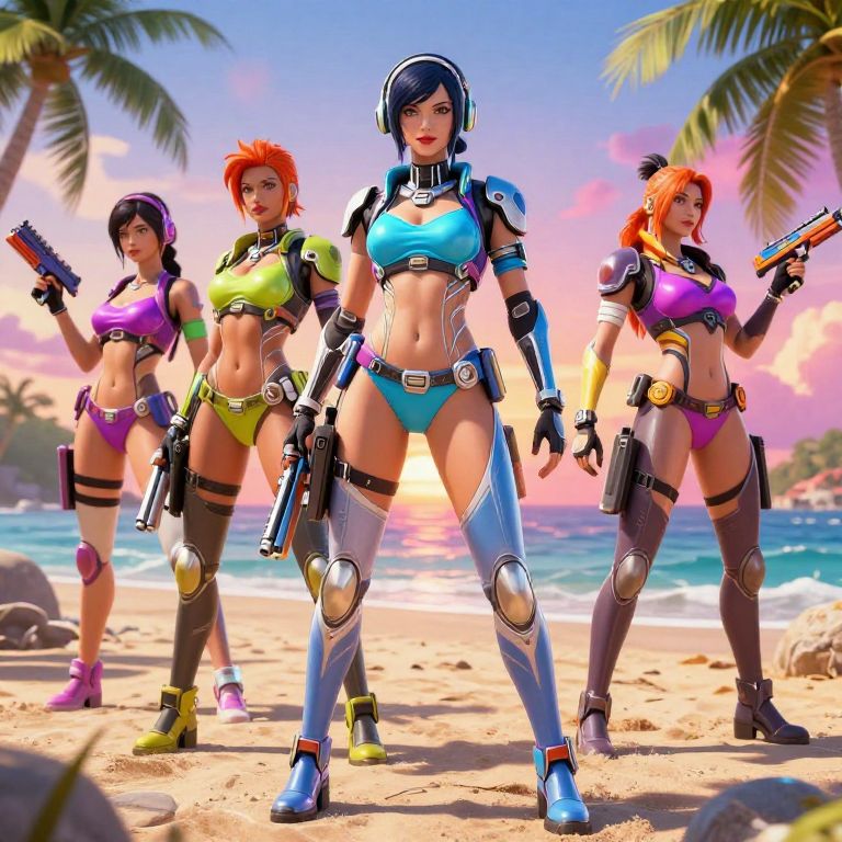 Digital art of four women in colorful, futuristic beachwear, holding guns, standing on a sandy beach with palm trees and a sunset.