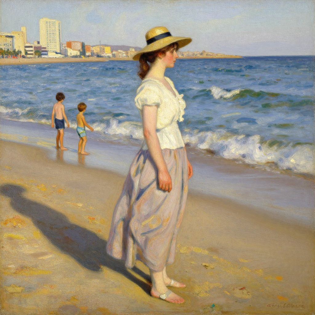 Impressionist-style painting: Woman in white top and pink-striped skirt, straw hat, stands on sunlit beach, shadow cast, two children playing