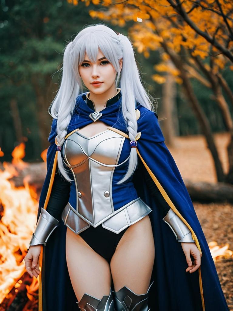 Photo-realistic image of a female cosplayer dressed as Grima from Fire Emblem, featuring white twin-tailed hair, red eyes, and a detailed blue and silver armored costume. She stands outdoors near a fire with warm autumn foliage background, showcasing vibrant colors and natural lighting with a shallow depth of field.