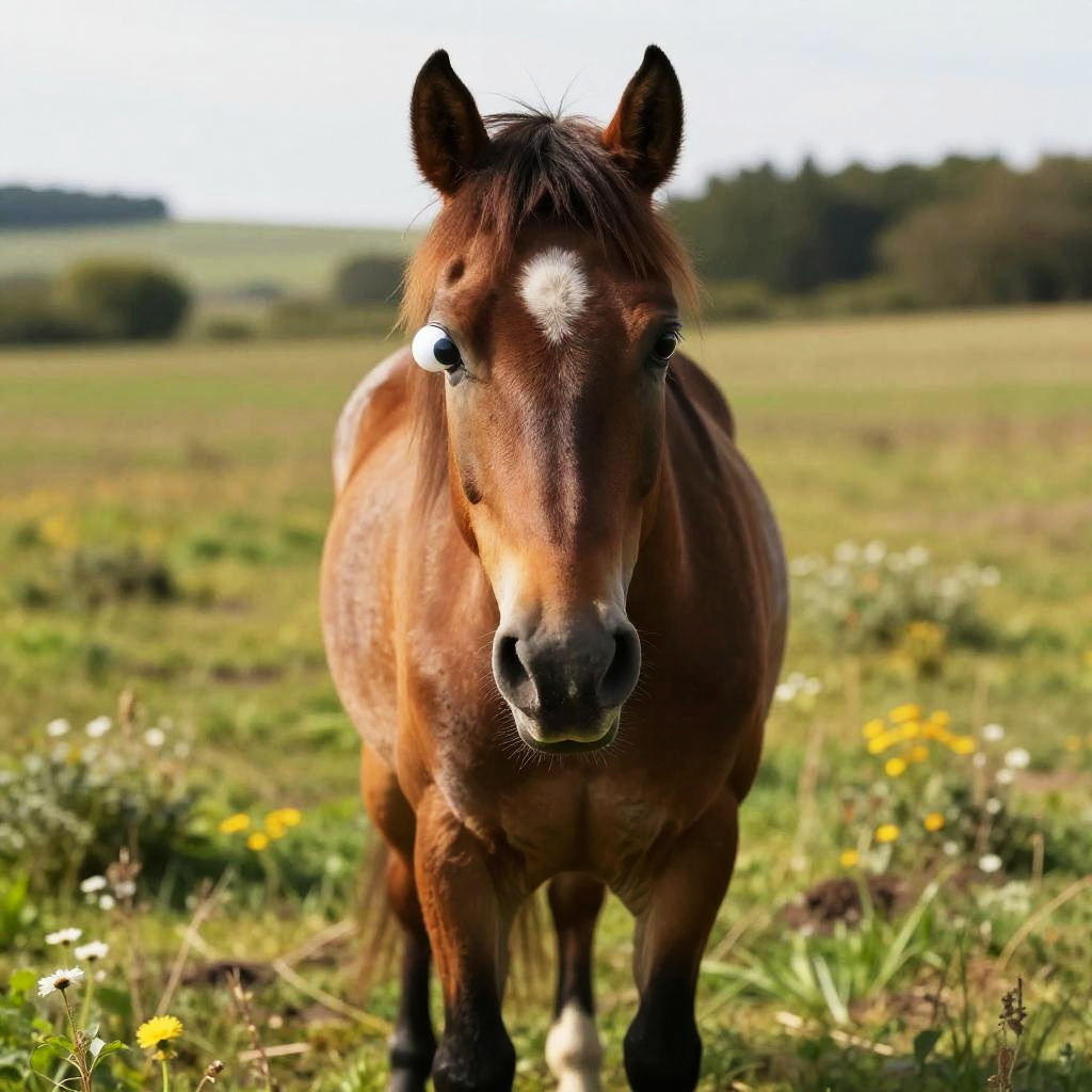 Whimsical Cross-Eyed Horse in Meadow