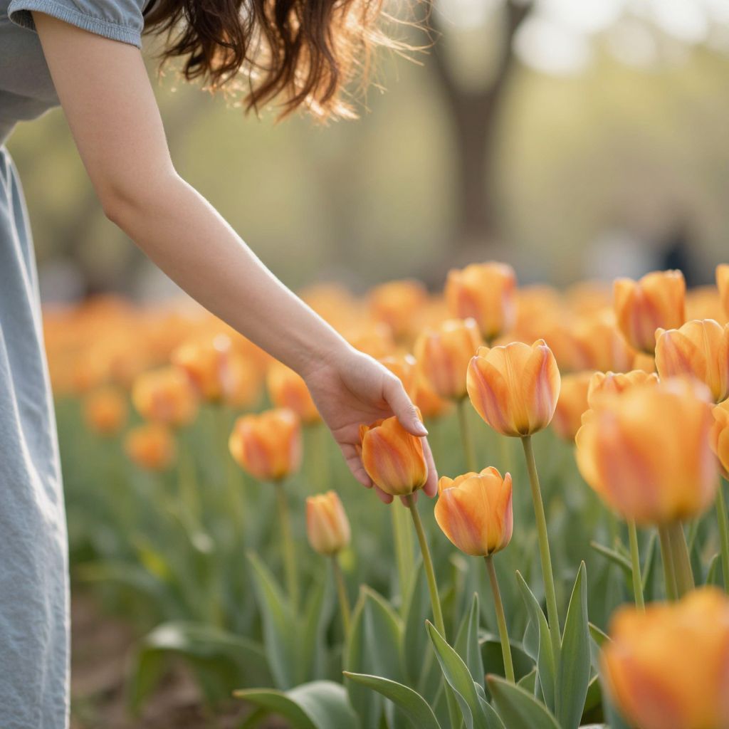 Woman gently touching vibrant orange tulips in a sunlit field, surrounded by lush green foliage and a soft, dreamy background.