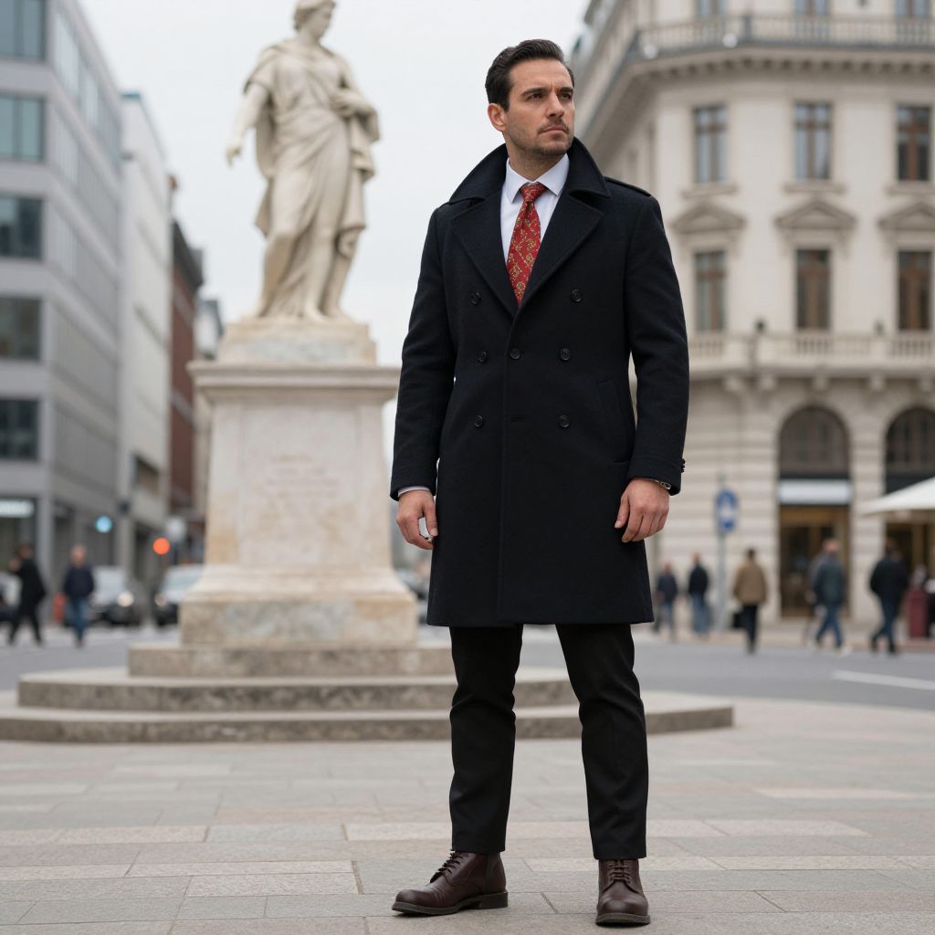 A man wearing a black coat with a red and gold tie and black pants with brown boots, standing on a street with a statue in the background. The man has a confident posture, with a distinguished appearance, and the scene is set in a cityscape with a mix of modern and historical architecture. The statue in the background is a classical marble sculpture, adding a touch of elegance and tradition to the setting.