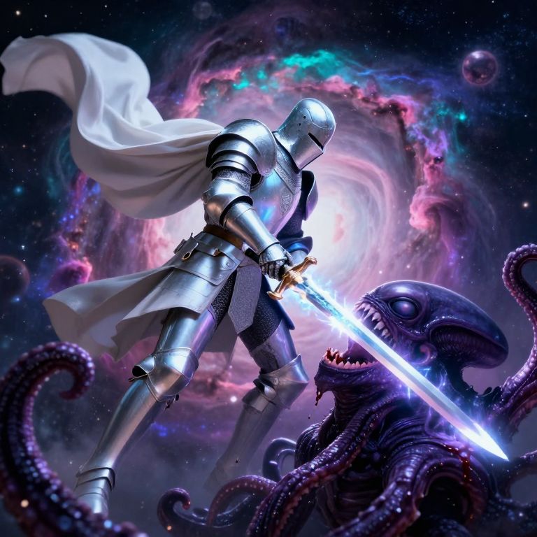 A digital fantasy artwork depicts a knight in shining silver armor with a white cape, holding a glowing blue sword, poised to strike a monstrous, tentacled creature with red, glowing eyes and dark, purple skin. The background features a swirling nebula with vivid colors of pink, blue, and purple, set against a starry, dark space. The knight's armor is detailed with plate sections and chainmail, while the creature's texture is slimy and grotesque. The scene is dynamic, with the knight in a powerful stance and the creature cowering, creating a dramatic, otherworldly battle.