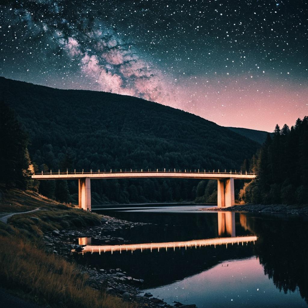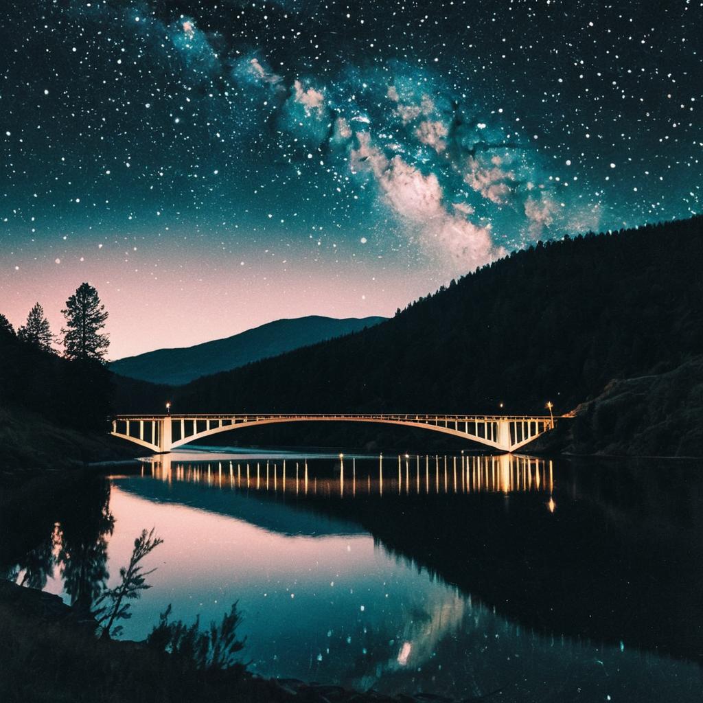 Valley A bridge by a lake at night, in the style of Existentialism, muted pastels, captivating lighting, glazed surfaces, abstract expressionism, creative commons attribution: sky full of blazing stars