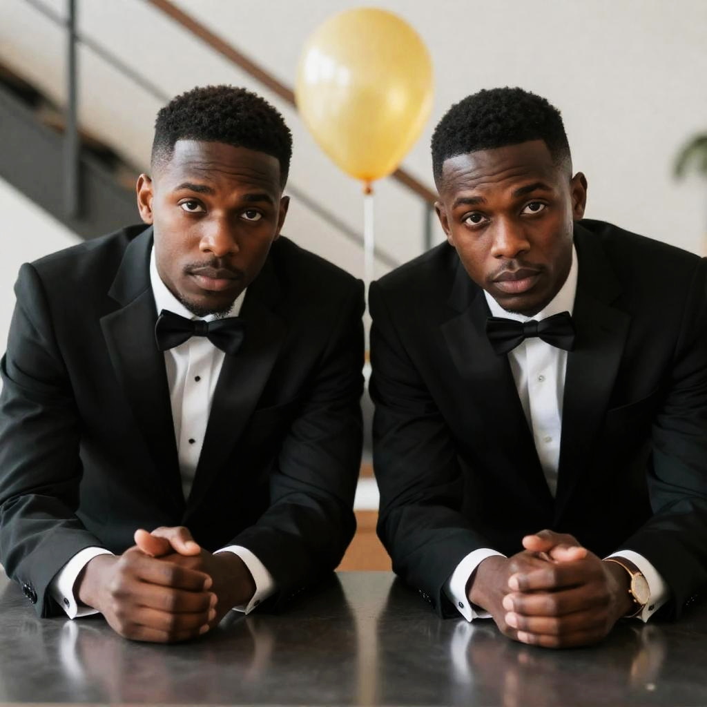 Two Black men in black tuxedos with white shirts and black bow ties, leaning forward on a reflective table. Both have short hair, dark skin, and intense expressions. Background includes stairs and a yellow balloon. Indoor setting.