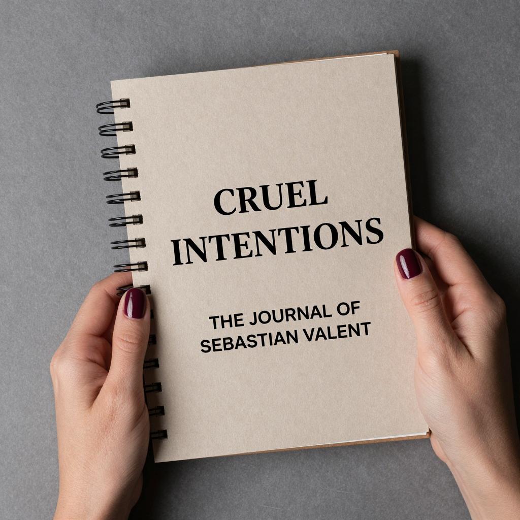 Two hands with maroon-painted nails hold a beige spiral-bound notebook. The notebook has black spiral binding on the left and in black serif font: "CRUEL INTENTIONS" in larger letters, "THE JOURNAL OF SEBASTIAN VALENT" below. The background is a ured gray surface.