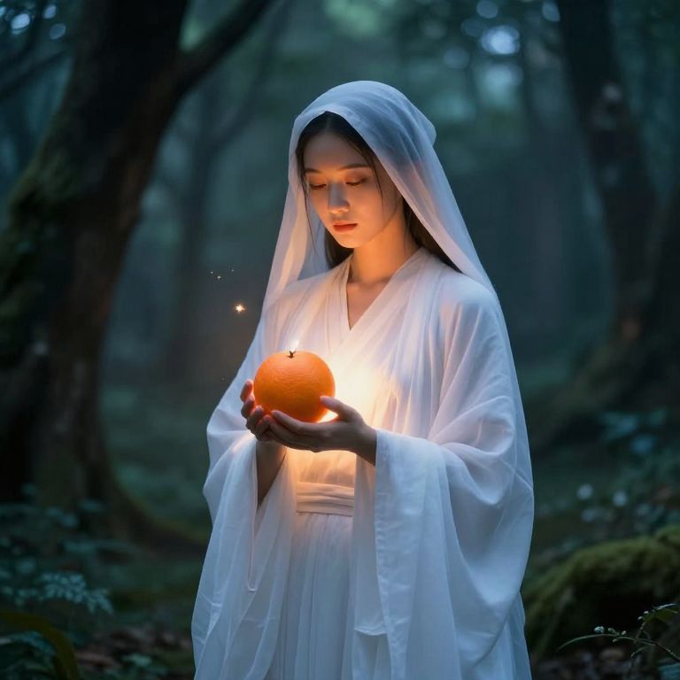 A spectral figure draped in ethereal white robes stands amidst a mystical forest, cradling a radiant orange fruit that glows with otherworldly light, casting an enchanting aura over the scene.
