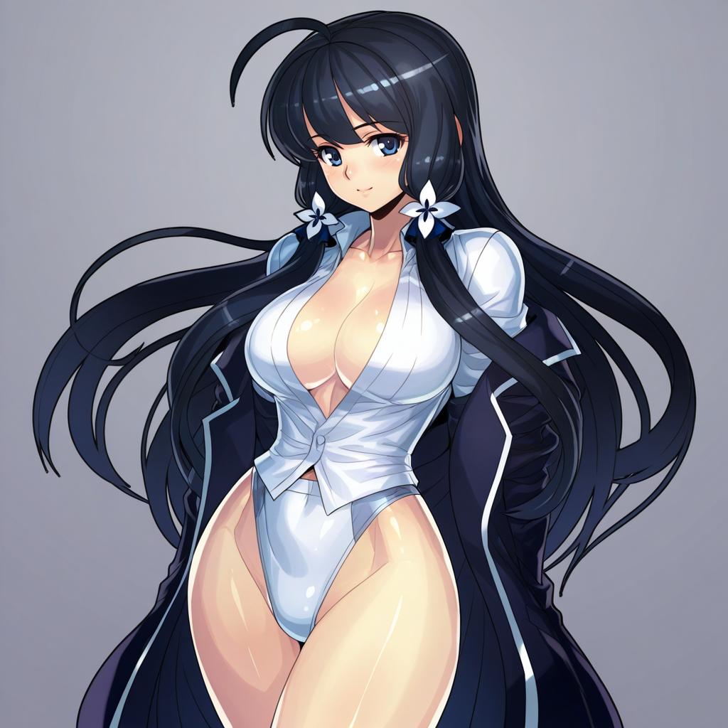 Anime-style illustration of a young woman with long black hair adorned with white flower hairpins. She has blue eyes and wears a partially unbuttoned white shirt over a high-cut white bodysuit, paired with a dark jacket draped over her arms. The image features detailed shading and a neutral gray background.