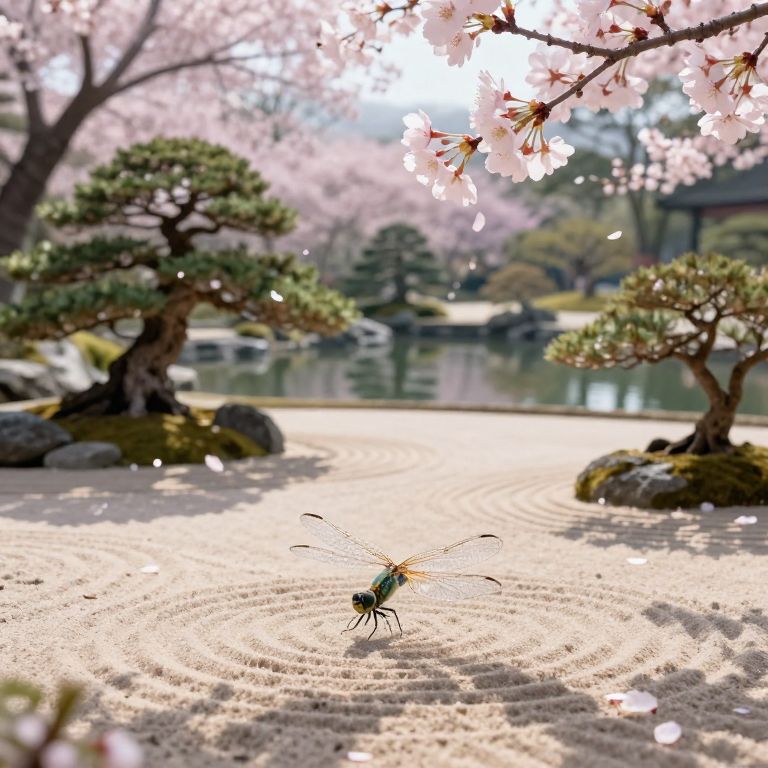 Photograph of a serene Japanese garden featuring a small green and yellow insect with long, delicate wings standing in the center of a circular sand pattern. Pink cherry blossoms hang from branches in the upper right, with sunlight filtering through. Two bonsai trees with twisted trunks are on either side of the sand, leading to a tranquil pond in the background. Soft sunlight casts gentle shadows, and petals are gently falling, creating a peaceful, ethereal atmosphere. The scene is composed with a shallow depth of field, emphasizing the insect and cherry blossoms.