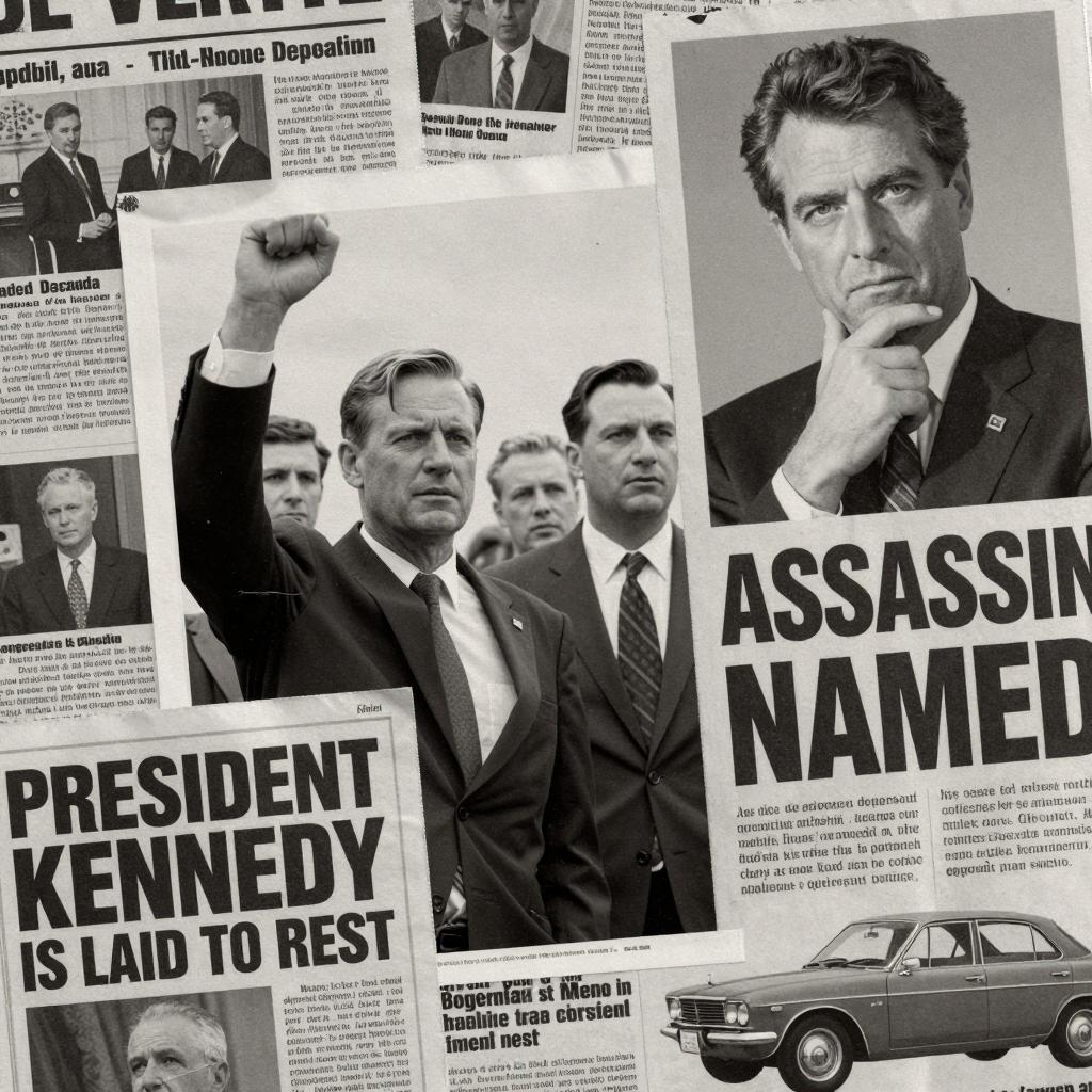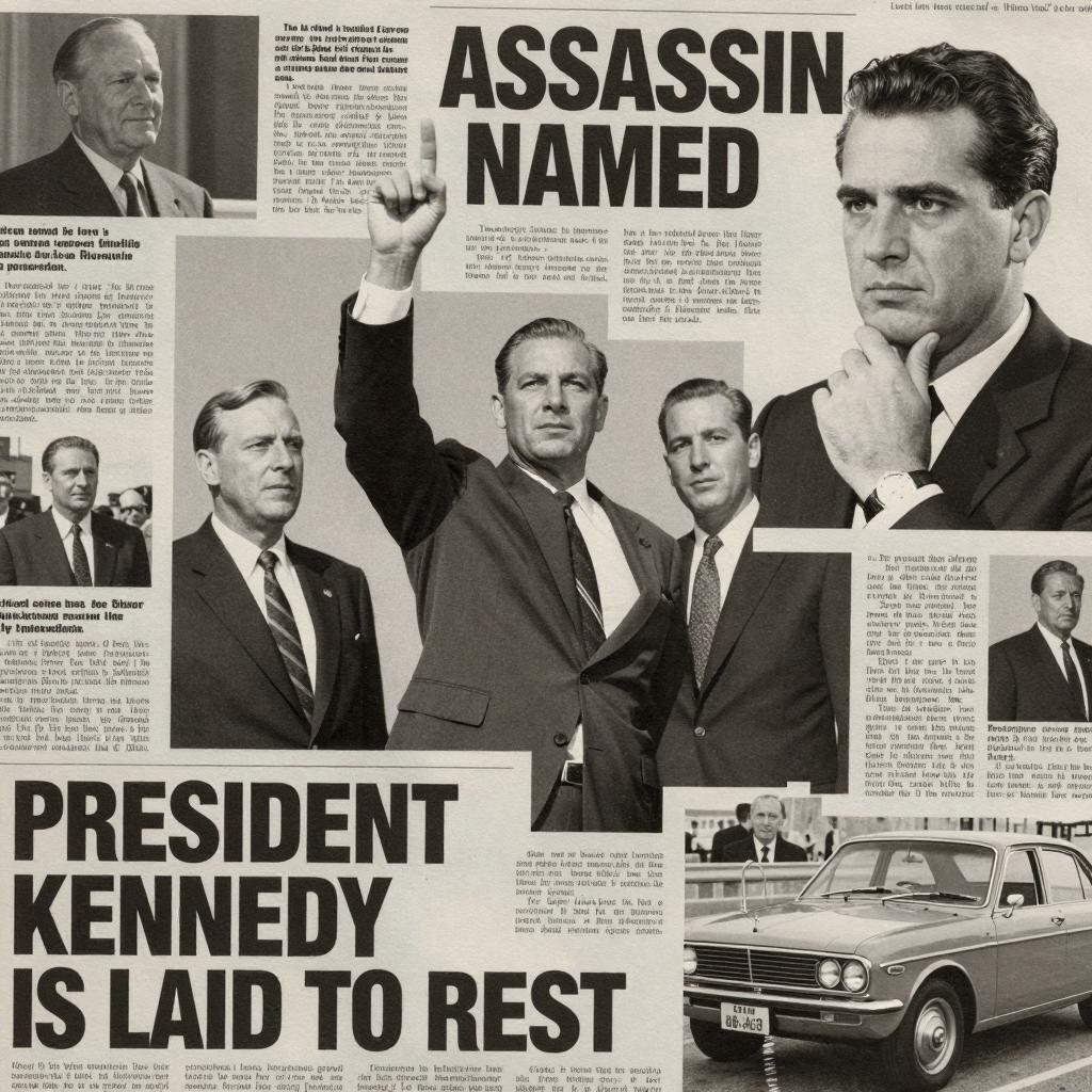 Photograph of a cluttered collage of newspaper clippings. Central black-and-white image of men in suits, one with raised arm. Top right portrait of a man in a suit with dark hair, hand on chin. "ASSASSIN NAMED" headline. Bottom left "PRESIDENT KENNEDY IS LAID TO REST" headline. Various smaller images, , and a car. Textures include paper, ink.