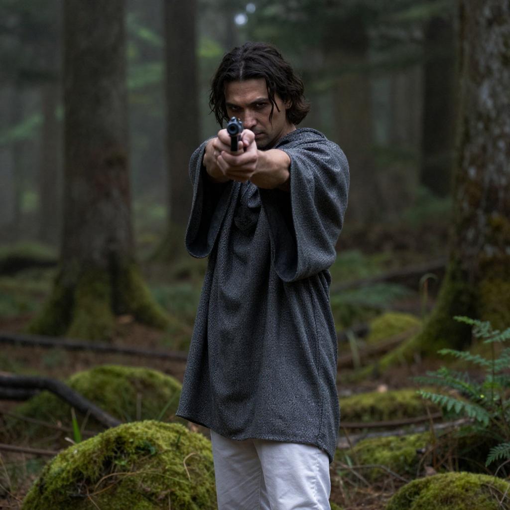 Man with long, unkempt hair, brown hooded robe, and brown scarf, holding a rifle, aiming forward. Blue sky background, rocky edge on the right. Intense expression, rugged appearance.