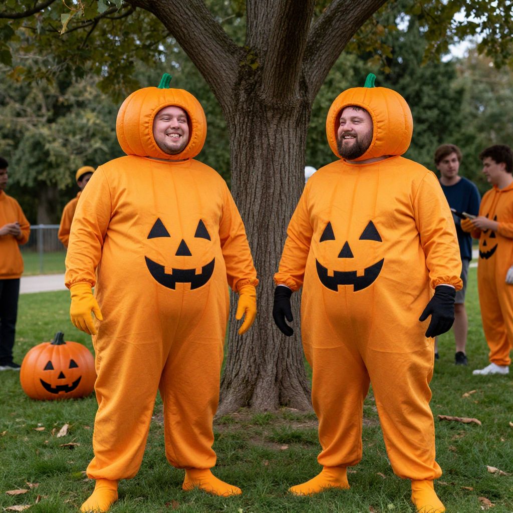 Plus size pumpkin costume, male focus, multiple boys, outdoors, 2boys, fat, gloves, hood, standing, full body, parody, smile, grass, cosplay, tree, facial hair