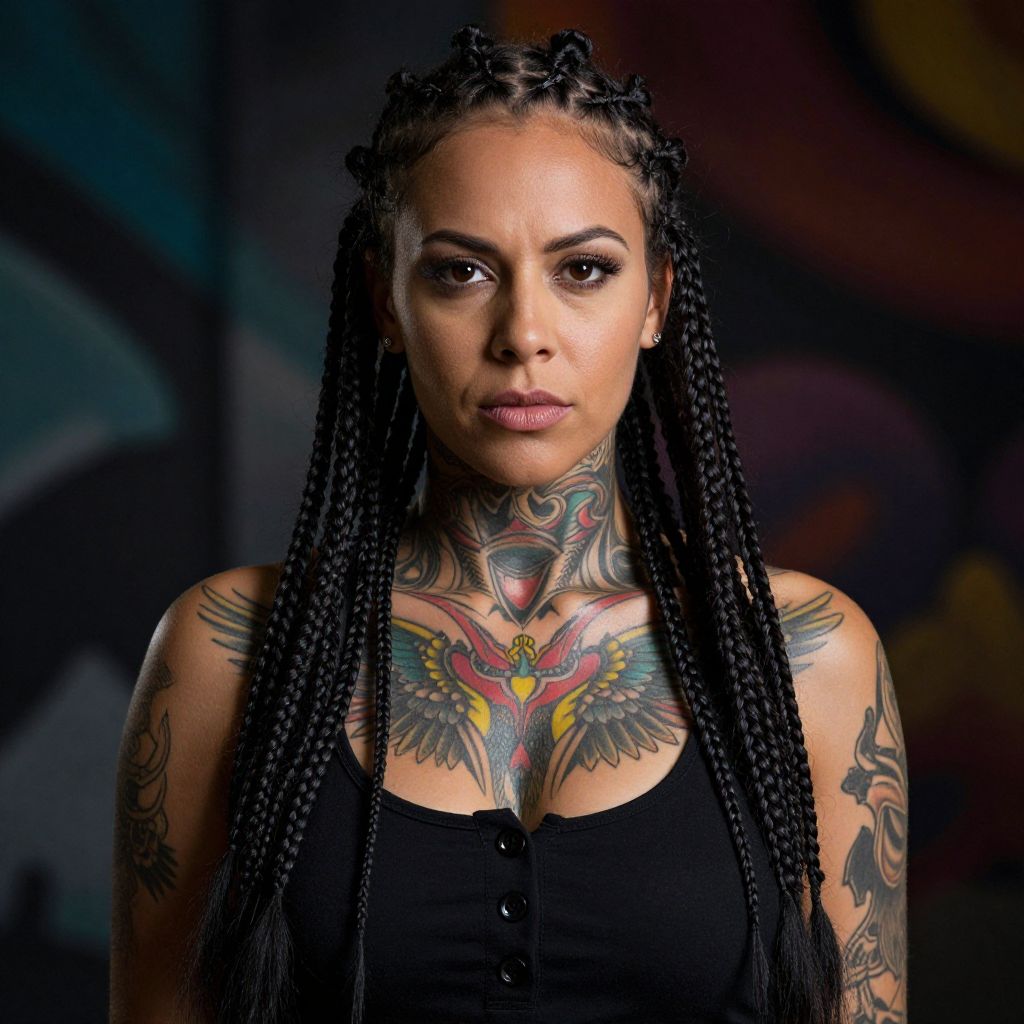 Photograph of a woman with dark, wavy hair in two braids, wearing a black, button-up top. She has a striking, colorful tattoo across her chest and neck, featuring a symmetrical design with wings and flowers. Her skin is light brown, and she has a serious, focused expression. The background is blurred with dark, colorful hues, putting emphasis on her and her tattoos.