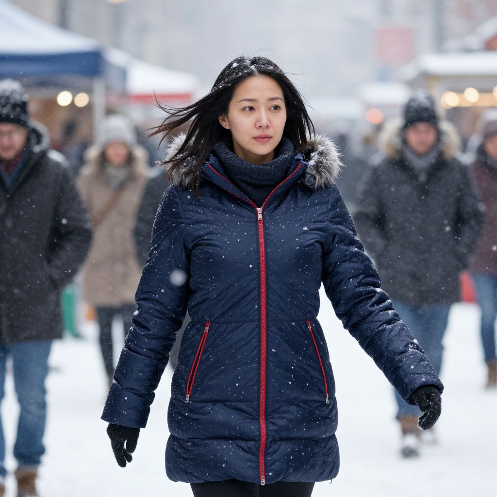 A woman in her early 30s with straight black hair and a neutral expression wearing a winter-themed down coat with a starry pattern and red trim, walking through a bustling downtown market during a heavy snowfall, the coat flapping dramatically in the wind with snowflakes falling around her.. The woman has big tits and cute face