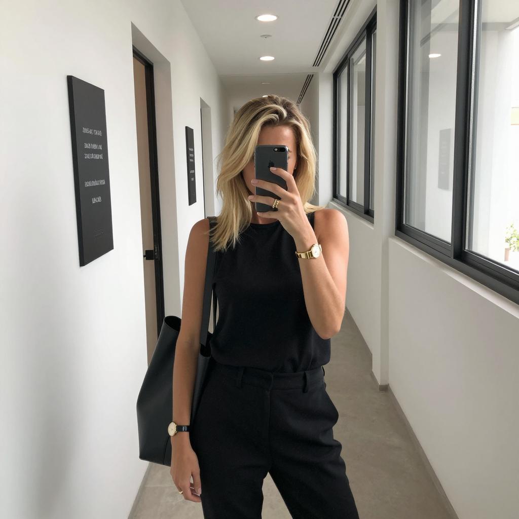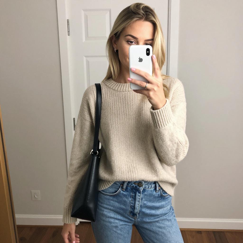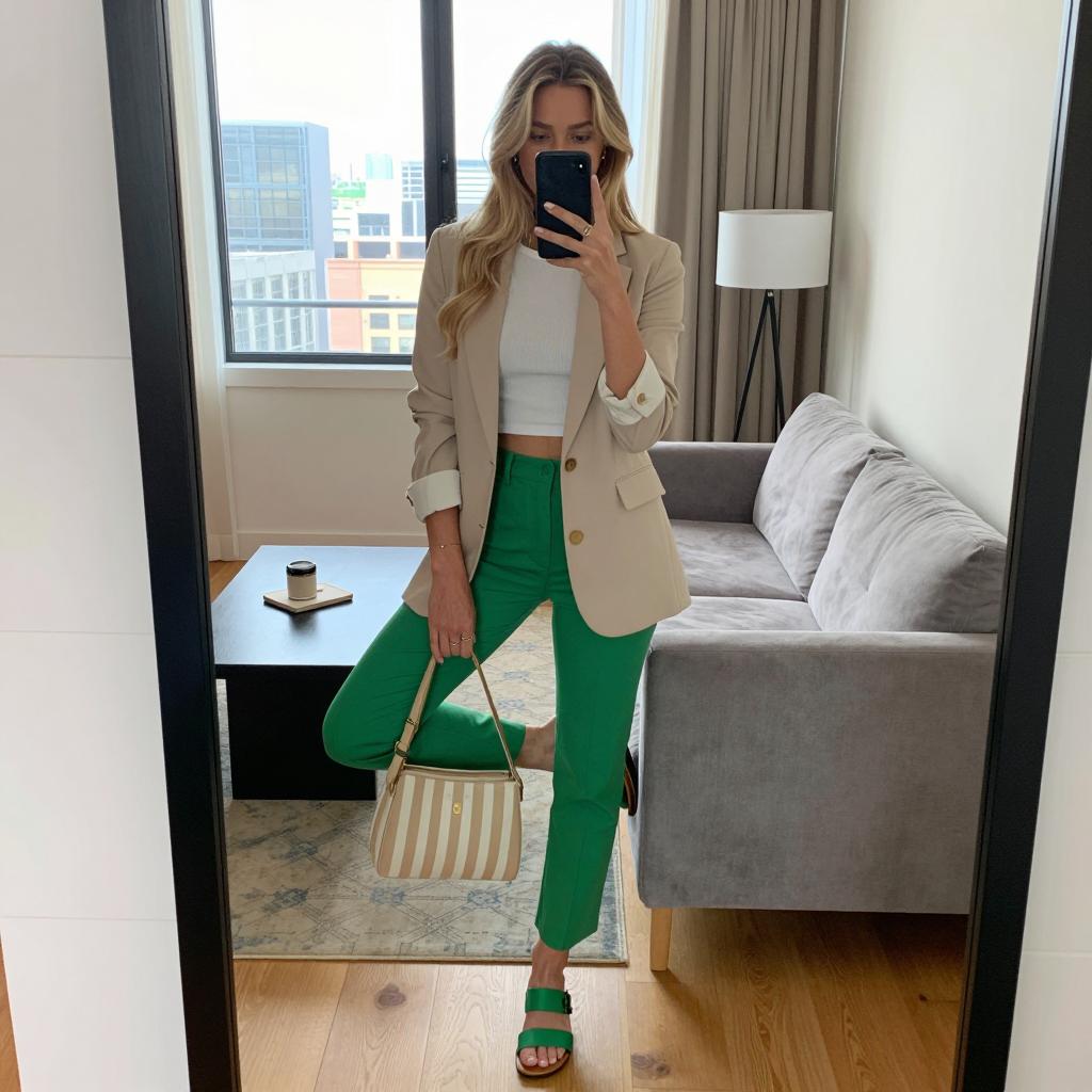 Photograph of a woman taking a mirror selfie with a green iPhone. She has blonde hair in a ponytail, wears a light green tank top, white pearl necklace, gold hoop earrings, pink nail polish, gold ring, and a white scrunchie on her wrist. She holds a light green crossbody bag. The background is white vertical panels. Her face is not visible. The mirror is circular.