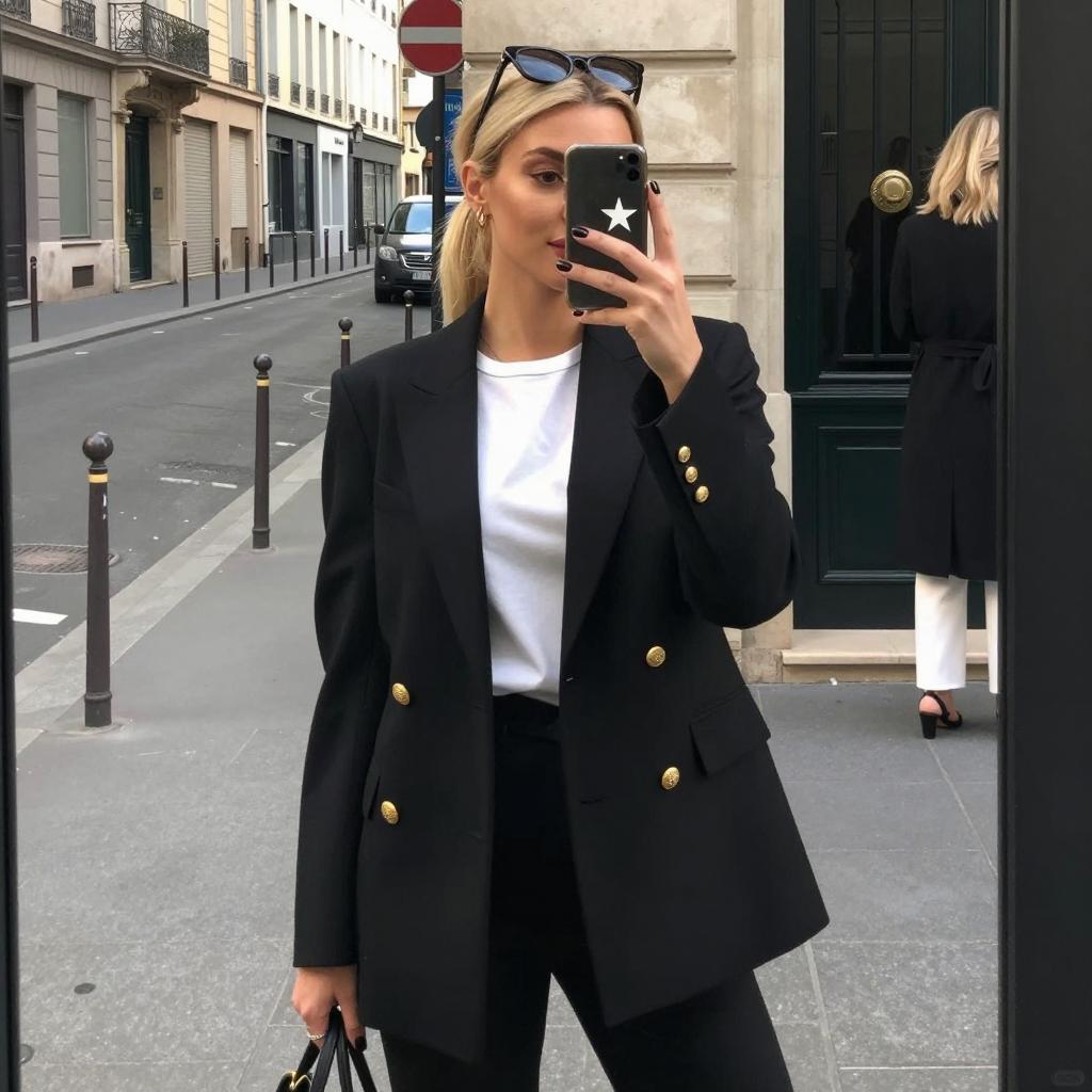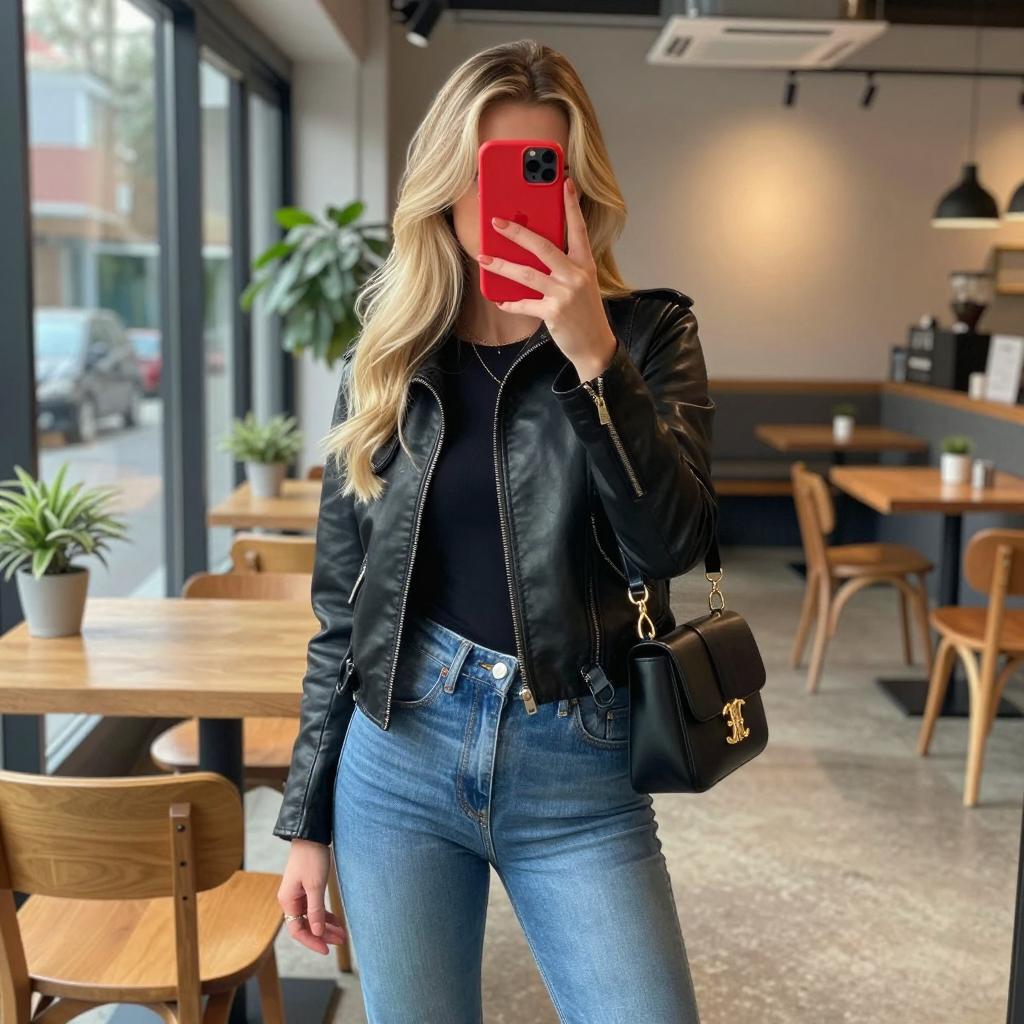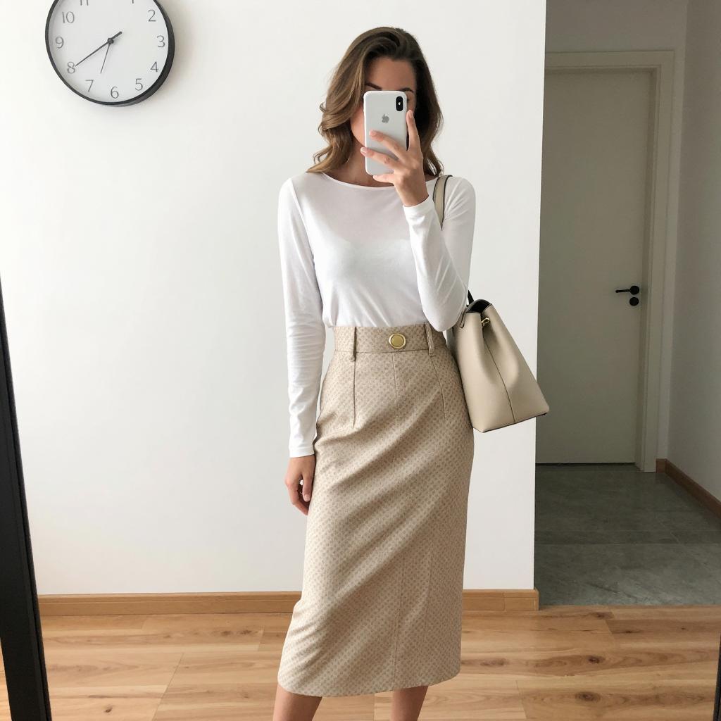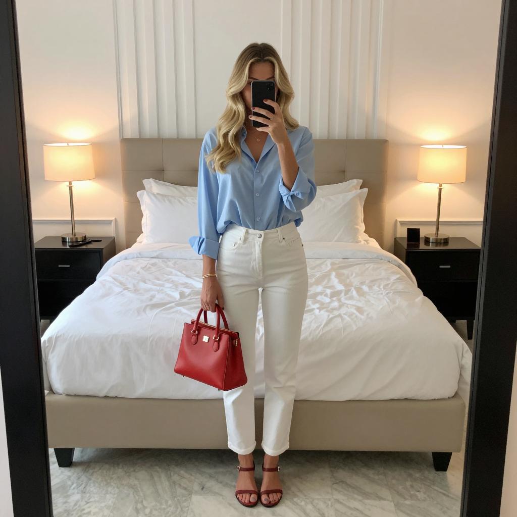 Photograph of a woman taking a mirror selfie with a green iPhone. She has blonde hair in a ponytail, wears a light green tank top, white pearl necklace, gold hoop earrings, pink nail polish, gold ring, and a white scrunchie on her wrist. She holds a light green crossbody bag. The background is white vertical panels. Her face is not visible. The mirror is circular.