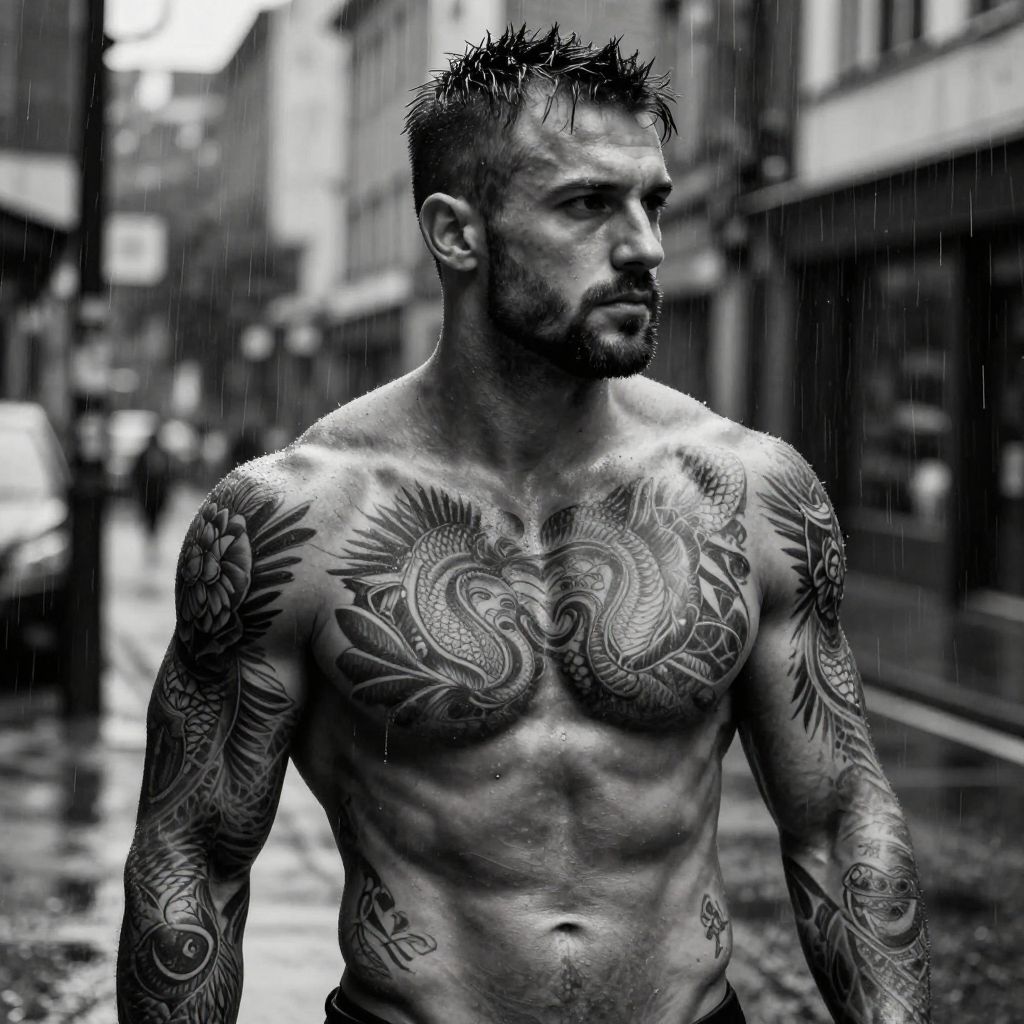 A black-and-white photograph of a muscular, shirtless man with short, spiked hair and a trimmed beard. He has extensive, intricate tattoos covering his chest, arms, and shoulders, including a large, detailed bird design on his chest. His skin is wet, suggesting rain, with droplets visible on his hair and body. He stands in a rainy urban street, with blurred buildings and a parked car in the background, looking off to the side with a serious expression. The image has a high-contrast, gritty texture, emphasizing the man's tattoos and muscular physique.