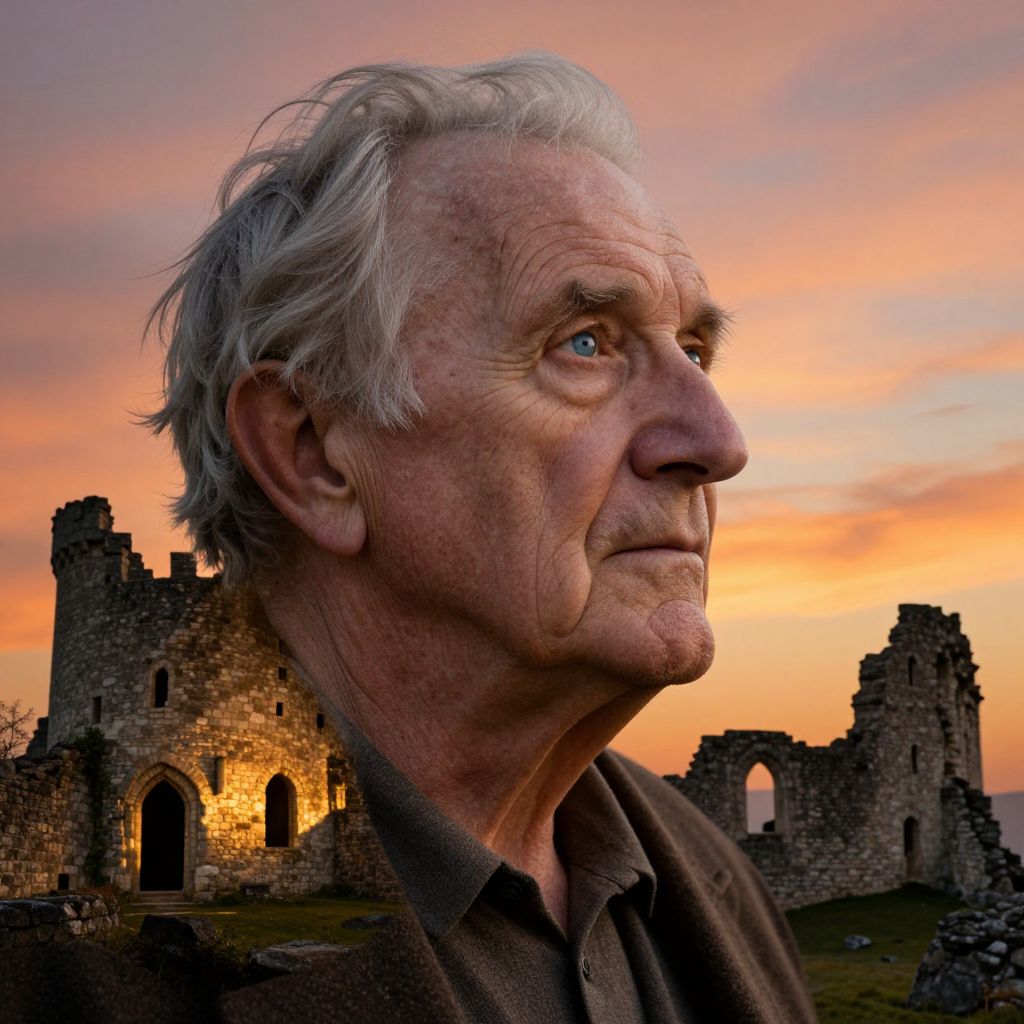 Photograph of an elderly man with white hair, wrinkled skin, and blue eyes, standing before a sunset-lit, ruined stone castle.