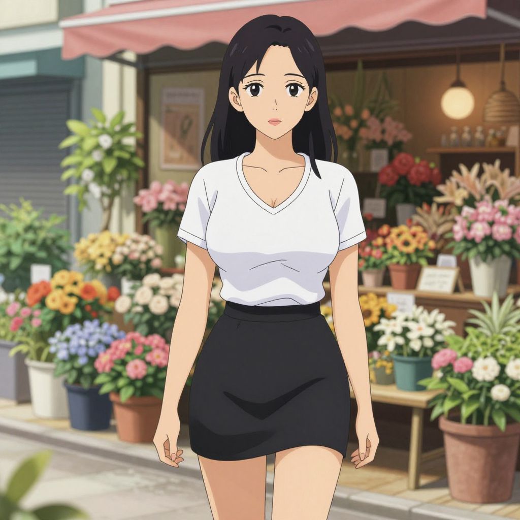 A slim woman in a casual chic outfit featuring a white V-neck T-shirt and a black mini skirt, set in a vibrant flower shop on a busy street corner, illustrated in the style of Kyoto Animation. Sexy. Pretty face and beutiful eyes Sexy. Pretty face and beаutiful eyes. Big breasts