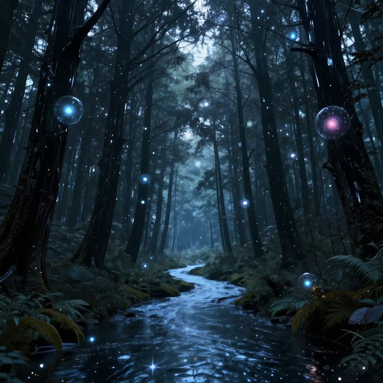 Digital artwork of a mystical forest at night, featuring a glowing blue stream, bioluminescent bubbles, and ethereal light filtering through tall trees.