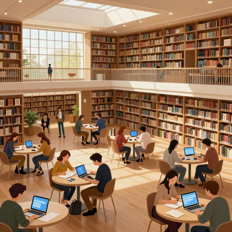 Societ illustrated as a massive library or knowledge hub with people of all backgrounds studying, collaborating on digital devices, and sharing ideas within grand architectural spaces filled with books, ambient natural light, and a peaceful, inspiring atmosphere.