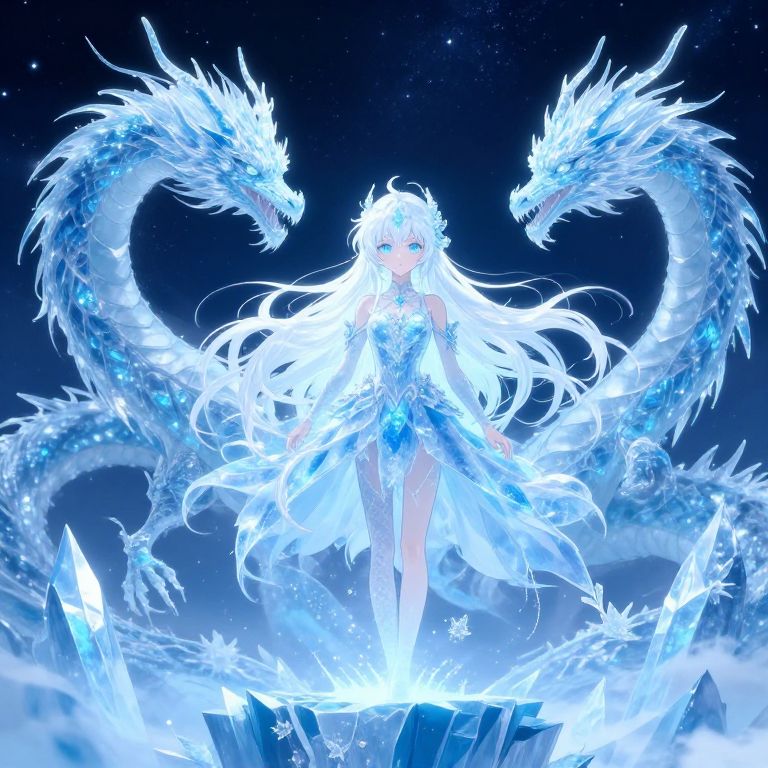 Ice anime character, a young girl with sparkling ice-blue eyes and flowing white hair, surrounded by mystical ice dragons made of shimmering frost, standing atop a glacier under a starry night sky, beautifully detailed fantasy anime style