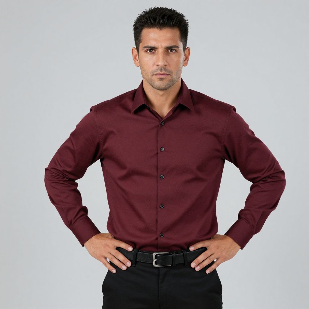 Photograph of a tall, bearded man standing against a solid dark blue background. He has short, dark hair and wears black sunglasses. His attire includes a light pink, long-sleeved dress shirt with the sleeves rolled up to the elbows, black dress pants, and black dress shoes. A silver watch with a black band is on his left wrist. The floor is light gray, creating a subtle contrast with his clothing. His stance is relaxed, with his arms slightly away from his body and his hands resting at his sides. The overall style is modern and professional.