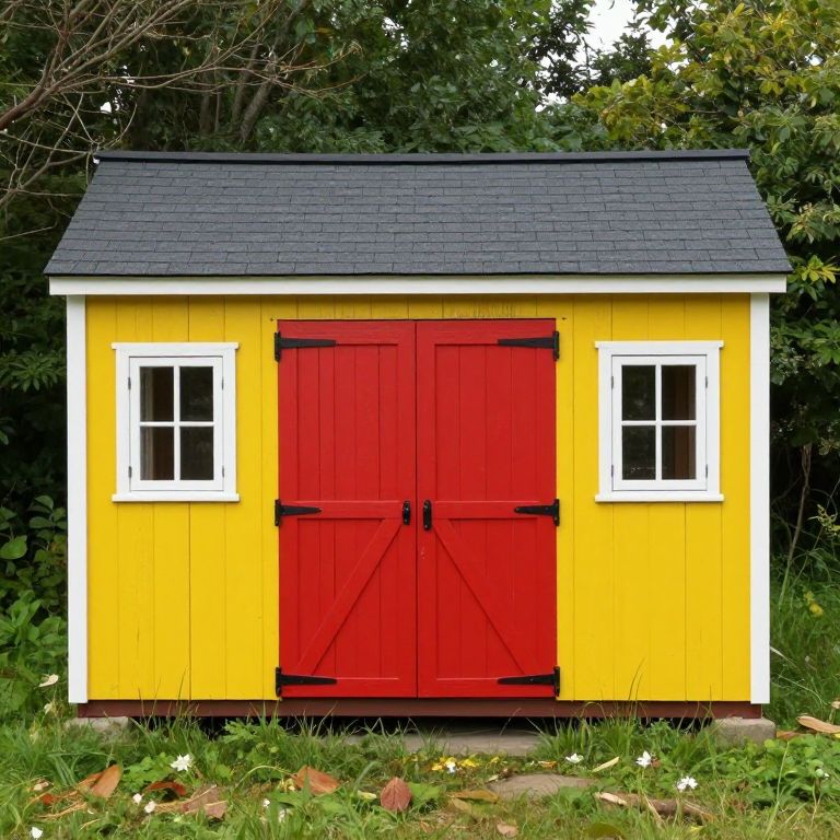 A charming wooden farm shed stands prominently in a grassy yard, featuring a vibrant yellow exterior, two red double doors with black hinges, and two white-framed windows, all beneath a dark gray shingled roof.