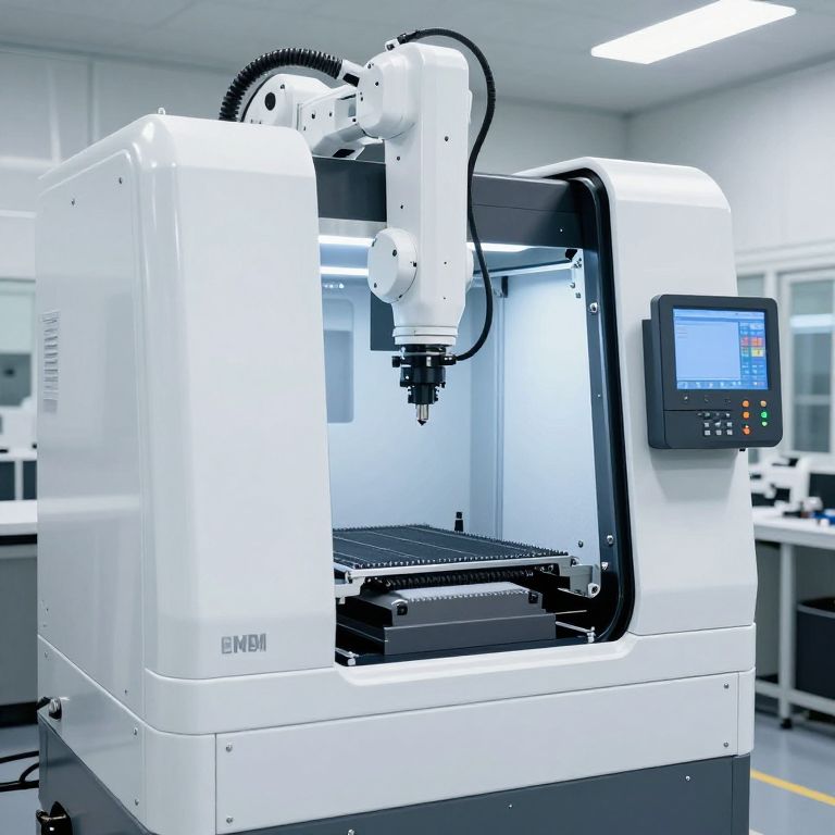 Panel BMO automation futuristic CNC machine robot in a clean white factory. cinematic, photorealistic, hyper realistic,