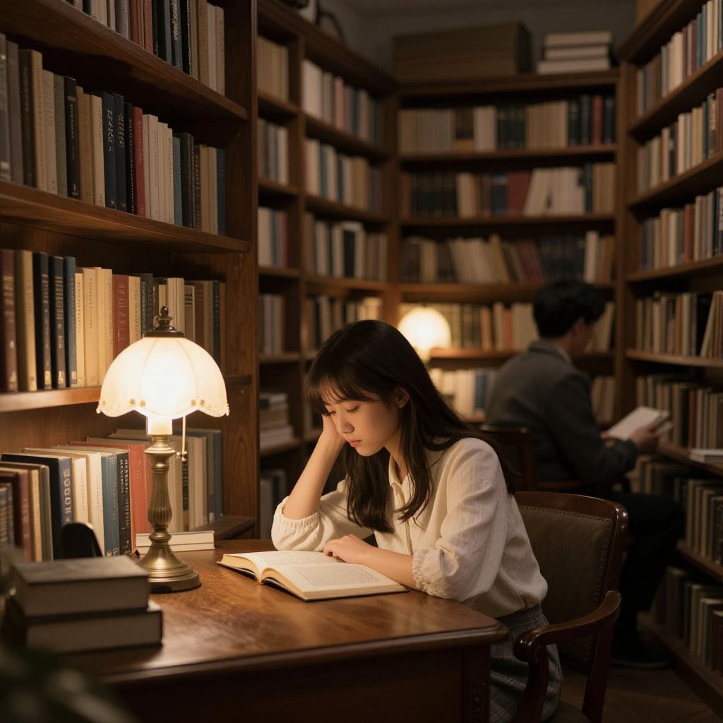 Photograph of a dimly lit library. A young Asian woman with long black hair, wearing a white blouse, sits at a wooden desk, resting her head on her hand, deep in thought while reading an open book. A vintage lamp with a white, frilled shade illuminates the desk. In the background, another person, slightly blurred, reads at a nearby desk. Tall wooden bookshelves filled with books line the walls, creating a cozy, scholarly atmosphere. The warm, soft lighting enhances the serene, contemplative mood.