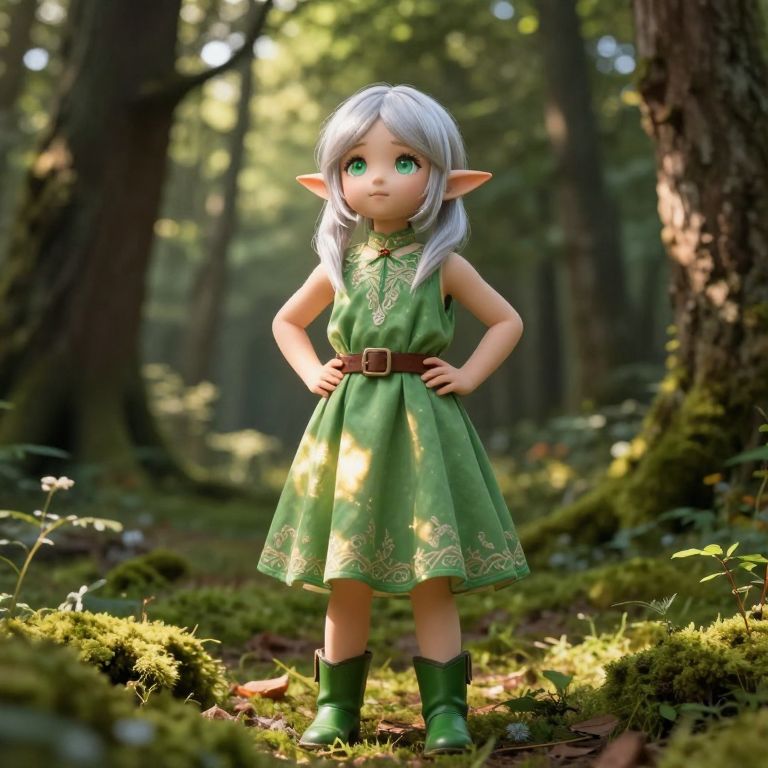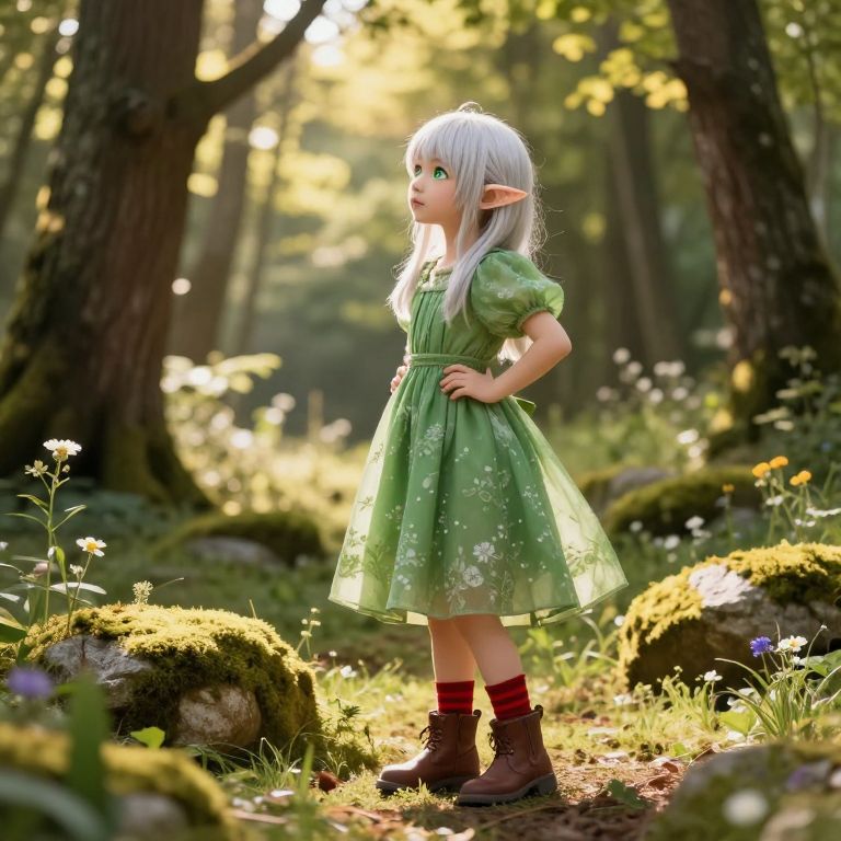 A young female elf girl with silvery-white hair gently flowing in the breeze, large sparkling green eyes, and a soft, fair complexion. She wears a beautifully detailed green dress with intricate gold embroidery along the sleeves and hem, and pairs it with sturdy brown leather boots that give her a grounded, adventurous look. She stands in a sun-dappled forest clearing, surrounded by tall mossy trees and glowing mushrooms, with a warm, serene expression that suggests both grace and curiosity. The scene is ethereal and magical, with soft ambient light filtering through the leaves.