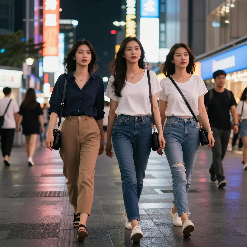 Beautiful Asian women in modern fashion, walking through a bustling neon-lit city street at night, dynamic composition, vivid colors, urban background with reflections